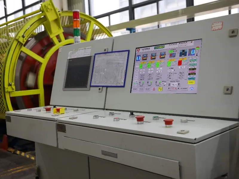 Машина оснащена системой управления MMI+PLC для предварительной настройки шага скрутки, направления скрутки, автоматического контроля компенсации натяжения и синхронизации скорости с тянущим шпилем и намоточным устройством.
